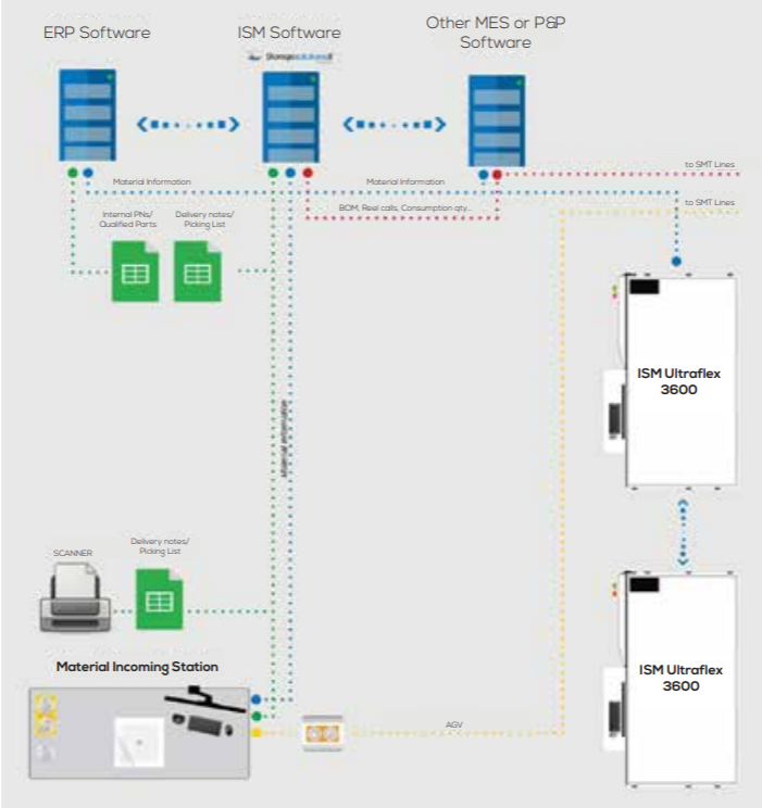 The connection with other systems (ERP, MES, Pick and Place, etc) is possible thanks to the API interface that allows anysoftware to communicate and receive information from the Incoming Material Station Automatic file sharing with othersoftware is also possible.